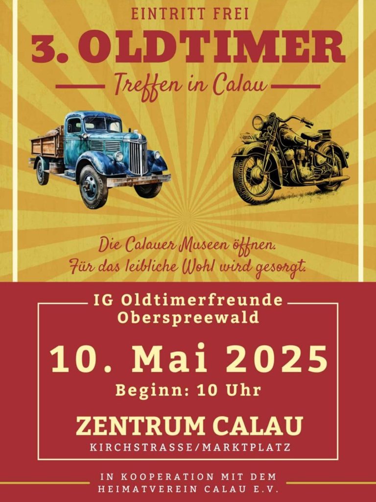Wir haben die großartige Möglichkeit den Stand zum Kuchenverkauf beim Oldtimer Treffen in Calau am 10. Mai 2025 zu betreuen und Spenden zu sammeln.
